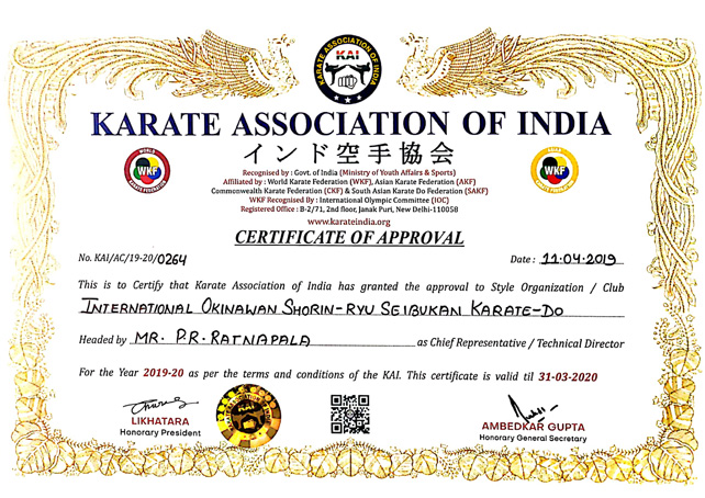 International Okinawan Shorin Ryu Seibukan Karate Do of India has been accredited by Karate Association of India (KAI) from April 2019.